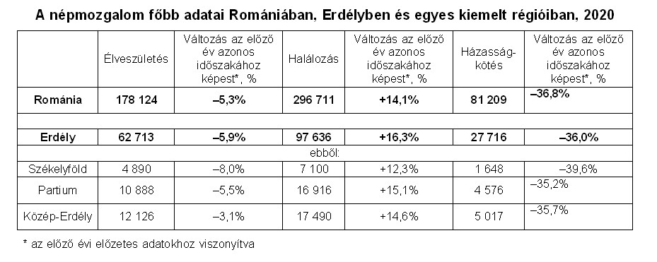 A megyei statisztikai hivatalok előzetes adataiból az Erdélystat által készített összesítés szerint Erdélyben tavaly 97.636 haláleset történt, ez az előző évi előzetes adatokhoz képest 16,3%-os, tehát az országos átlagot is valamivel meghaladó növekedést jelent az elhalálozásokban. Ezzel szemben csak 62.713 gyermek jött világra, ami 3906 fővel, vagyis 5,9%-kal múlta alul az egy évvel korábbi, 2019-es születésszámot. A népességfogyás mértéke 34.928 volt, bő duplája az előző évinek. Erdély 16 megyéjében 27.716 házasságot kötöttek, 36%-kal kevesebbet, mint 2019-ben.