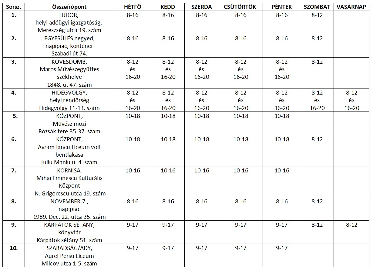 Az utóbbi napok tapasztalatai alapján és a helyiek visszajelzéseit figyelembe véve március 29-étől módosul az egyéni kitöltést segítő marosvásárhelyi helyszínek nyitvatartási rendje. Az összeírópontok helyszínenként változó program szerint lesznek nyitva.