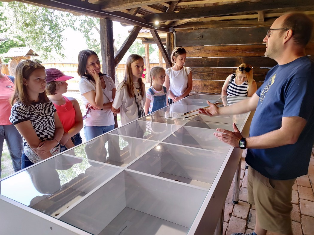 Az udvarra belépőket egy kis kiállítás fogadta, ahol a régészeti ásatások során Mikházán előkerült leleteket lehetett szemügyre venni: fém nyílhegyeket (akár háromélűt vagy éppen gyutacsosat is), az íjak merevítésére használt és a nyílvesszők végét erősítő csont- és fémkellékeket, de kétezer éves fémdarabot és salakot is, amelyek egyértelműen fémmegmunkálásra és fegyverkészítésre utalnak. Került elő a páncélzat részét képező díszített bronzpikkely, és egyéb érdekesség is.