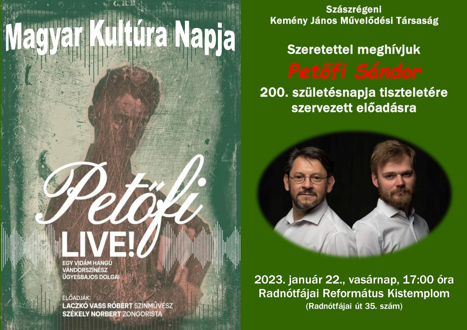 Január 22-én, vasárnap 17 órától a magyar kultúra napja alkalmából a radnótfájai református Kistemplomban (Radnótfájai út 35. szám) Petőfi Sándor születésének 200. évfordulója tiszteletére szervezett Petőfi live című előadás egy vidám hangú vándorszínész ügyes-bajos dolgairól szól.