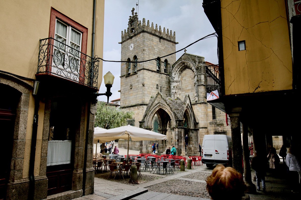 Portóban sok szépet láttunk, még akadna néznivaló, de az időnk véges, a mai útirány Guimaraes, Amarante, Baiao, illetve a Douro Palace szálloda a Douro völgyében. Guimaraes Portótól északra van, Portugália bölcsőjeként tartják számon. Itt született Afonso Henriques, ki Portugália első királyának kiáltatta ki magát 1139-ben, Guimaraes volt az ország első fővárosa. Guimaraes óvárosa ma a világörökség része. Dombos helyen fekszik, keskeny, macskaköves utcáival, régi templomaival, kolostoraival Portugália egyik látogatott helye. Első utunk a történelmi óvárosba, a Santiago térre vezet. Jellegzetes macskaköves tér, az épületek régiek és keskenyek, az ablakok nagy részében virágok. A tér túlsó vége, az Olajfaliget – Largo da Oliveira – egy régi templom, a Nossa Senhora de Oliveira székhelye. Stílusában keveredik a gótikus, bizánci és még ki tudja hány más. Az Afonso Henriques által alapított kolostor helyén van. Előtte egy érdekes, XIV. sz.-i ereklyetartó keresztet őriz. Habár az idő borús, sok a látogató. Kicsi a tér, de nem annyira, hogy ne férne el ott egypár vendéglő, hogy a fáradt turisták megigyanak egy-egy pohár bort, kávét vagy a jellegzetes sütiket kóstolgassák. Nézelődünk, utána találomra bemegyünk az egyik szűk utcába. Emléküzletek, cukrászdák sokasága, s az egyik kirakatban meglátok egy parittyát. Ilyet sem láttam rég, az unokáim fognak örvendeni neki. Az anyjuk azonban valószínűleg kevésbé.