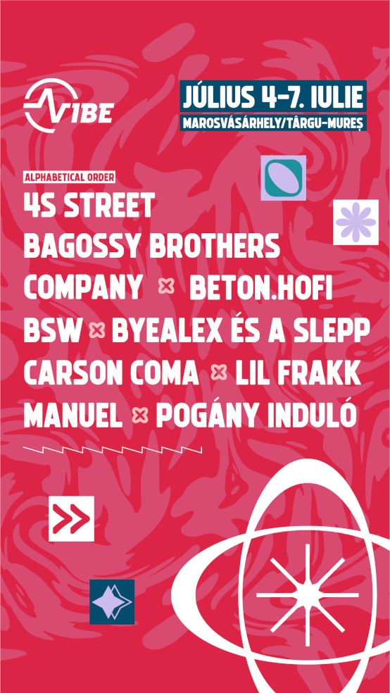 Nagyon sokan várják a 2024. július 4–7-i, hatodik VIBE Fesztiválra a Bagossy Brothers Companyt, mely tíz éve alakult Gyergyószentmiklóson. Mára Magyarországot is meghódította: a zenekar 2023-ben a legtöbbet streamelt „külföldi” előadó volt a magyar YouTube-on. Az erdélyi előadók közül már biztosan fellép a VIBE-on a 4S Street. A pop-rock műfajban szép sikereket elért, szintén gyergyószentmiklósi zenekar saját szerzeményekkel vált népszerűvé a magyar nyelvterületeken, a hazavágyódásról szóló legsikeresebb dalukat (Mesélek a bornak) már több mint húszmillióan látták a YouTube-on.