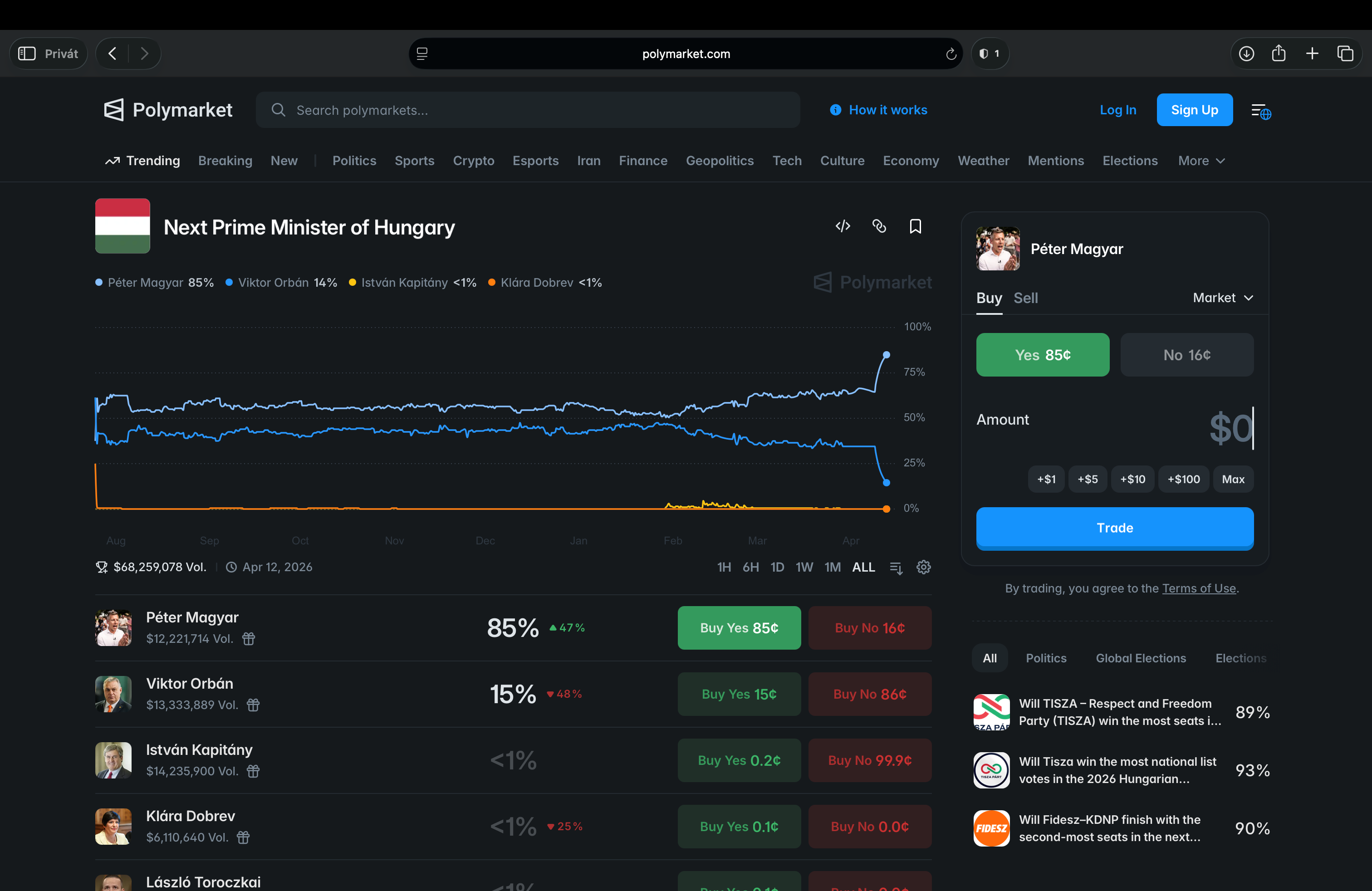 Viszont jelen állás szerint a Polymarketen elérhető fogadások szerint 87% annak az esélye, hogy Magyar Péter lesz Magyarország következő miniszterelnöke, míg Orbán Viktor csak 13%-on áll. Egy másik fogadás arról szól, hogy melyik párt nyeri meg a választásokat, itt 88% esélyt fogadtak meg a Tiszának. Továbbá egy harmadik szavazáson 84% az esélye annak, hogy Orbán Viktor elveszíti a miniszterelnöki széket. Az elmúlt napokban, egy negyedik szavazáson, 25%-ról 37%-ra emelkedett az az arány, amely szerint a TISZA alkotmányozó többséget, kétharmadot, fog szerezni a választásokon. Miközben utóbbinak az esélye növekszik csökken annak a valószínűsége – a Polymarket szerint – hogy a Mi Hazánk Mozgalom bejut a parlamentbe. Pár nappal korábban ennek a valószínűsége még 70% körül mozogott, mostanra 50%-ra esett vissza.