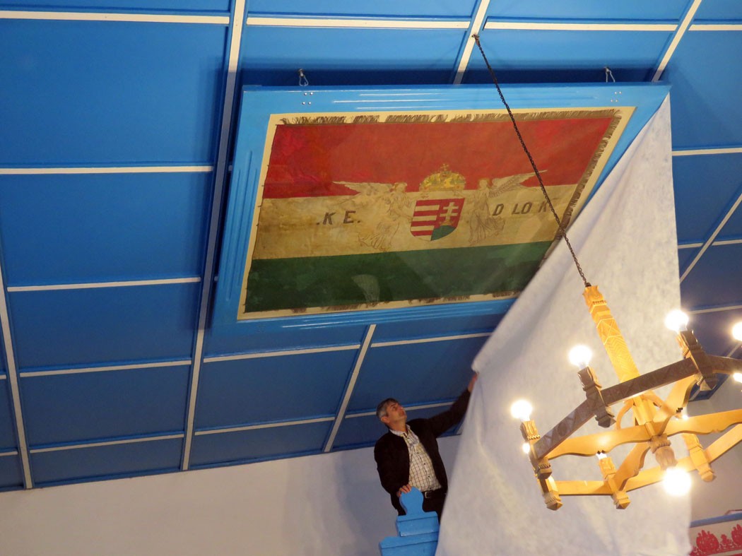 A zászlót a megóvása érdekében nem a falra tették vissza, hanem az egyesület megrendelésére a helyi Mihály Árpád asztalos egy üvegborítású fakeretet készített, ebben fektették le a zászlót vízszintesen, hogy megóvják a károsodástól. A fadobozt nehéz, körülményes munkával a presbiterek szerelték fel a templom mennyezetére, majd a vasárnapi ünnepségen leplezték le. Az ünnepi pillanatokat a marosvásárhelyi Jó Hír dicsőítő csapat hálaadó éneke tette fennköltebbé.