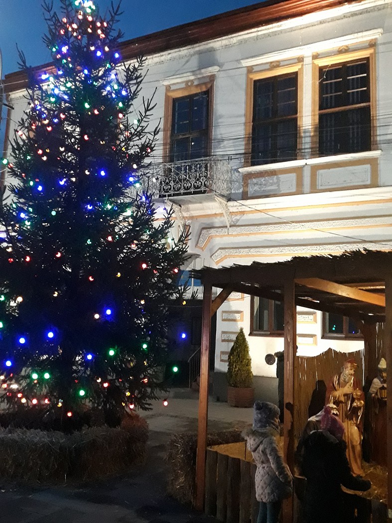 Karácsonyfa és betlehemes a városháza előtt Nyárádszeredában