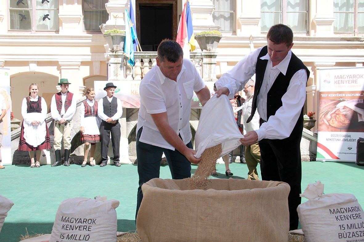 A kastély belső udvarában a búzaöntéssel folytatódott az ünnep. A mindennapok küzdelmeit vállaló gazdák hitét, erejét, szülőföldön való megmaradását elsőként Fazakas Miklós, a Romániai Magyar Gazdák Egyesülete Maros megyei szervezetének elnöke méltatta. Beszéde végén a megyei szervezet elnöke a magyar kormány támogatásáért mondott köszönetet. A továbbiakban Kovács Mihály Levente, a Maros Megyei Tanács alelnöke szólt a ,,közösen összeöntött remény” jelentőségéről, kiemelve, hogy a felajánlott gabona a rászoruló családoknak az életet jelenti. Csép Éva Andrea parlamenti képviselő a búza szimbolisztikáját járta körbe, majd így fogalmazott: „Mi, magyarok is búzaszemek vagyunk. Vajon nem azért vagyunk elszórva, hogy a világon mindenhol segíteni tudjunk egymásnak?”