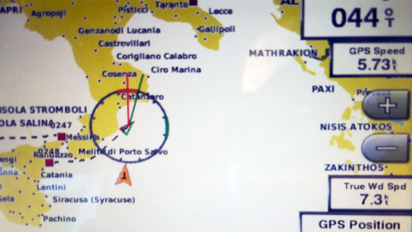 Taorminai látogatásunkat követően reggel indultunk tovább, kelet felé. Elhagytuk a csizma orrát, majd északkelet felé vettük az irányt. A tervünk az volt, hogy áthajózunk a Squillacei-öblön, majd Isola di Capo Rizutto után a Tarantói-öblön is, ahonnan élesen északnak fordulunk, és Brindisi körül, immár a sarkantyú keleti oldalán vagy lehorgonyzunk, vagy meg sem állunk, és keresztülvágunk az Adrián. A Messinai-szorosból érkező erős széllökésekben felhúztuk a vitorlákat, és meglehetősen nagy tempóval kezdtük a napot, de amint kikerültünk a szoros hatótávolságából, a szél elállt, és motoroznunk kellett. Délutánig szép, de eseménytelen napunk volt. Nagyjából húsz tengeri mérföldnyi távolságra haladtunk a parttól, gyönyörködtünk annak domborzatában és a part menti kisvárosokban, kerülgettük a halászhajókat, halászbójákat és tengeri halfarmokat, amelyeknél a háló felső fele a vízvonal fölött húzódik.