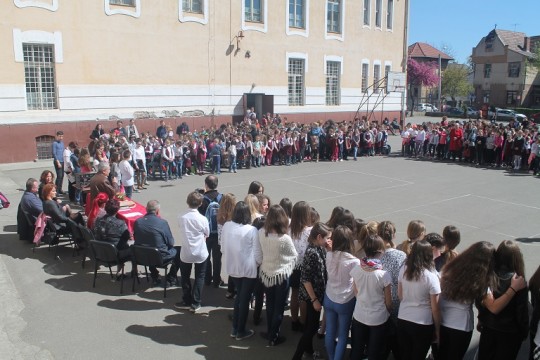 A marosvásárhelyi Dr. Bernády György Általános Iskola ötödikesei a névadó szobránál április 10-én, B...