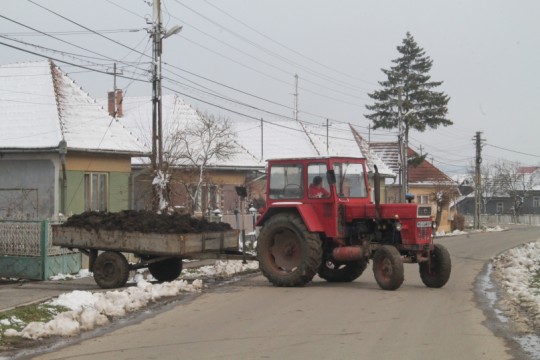 A somosdi Kiss Miklós és Szász Mihály gazdálkodó szerves trágyával megrakott traktorral igyekszik a...